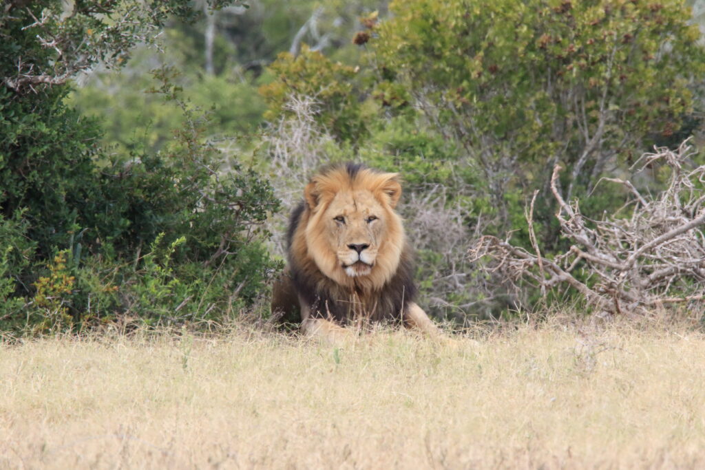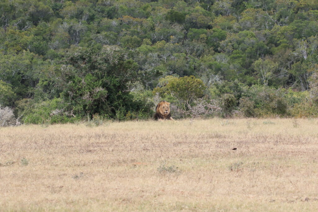 Because the animals have to find water, that narrows down the region where the predators have to look for them. Two lions were relaxing in the shade near a dry water hole in the south of the park. The other lion is hidden in the grass behind this one. Given how the nearby hole was dry, they might be waiting a while before any herds of animals arrive.
