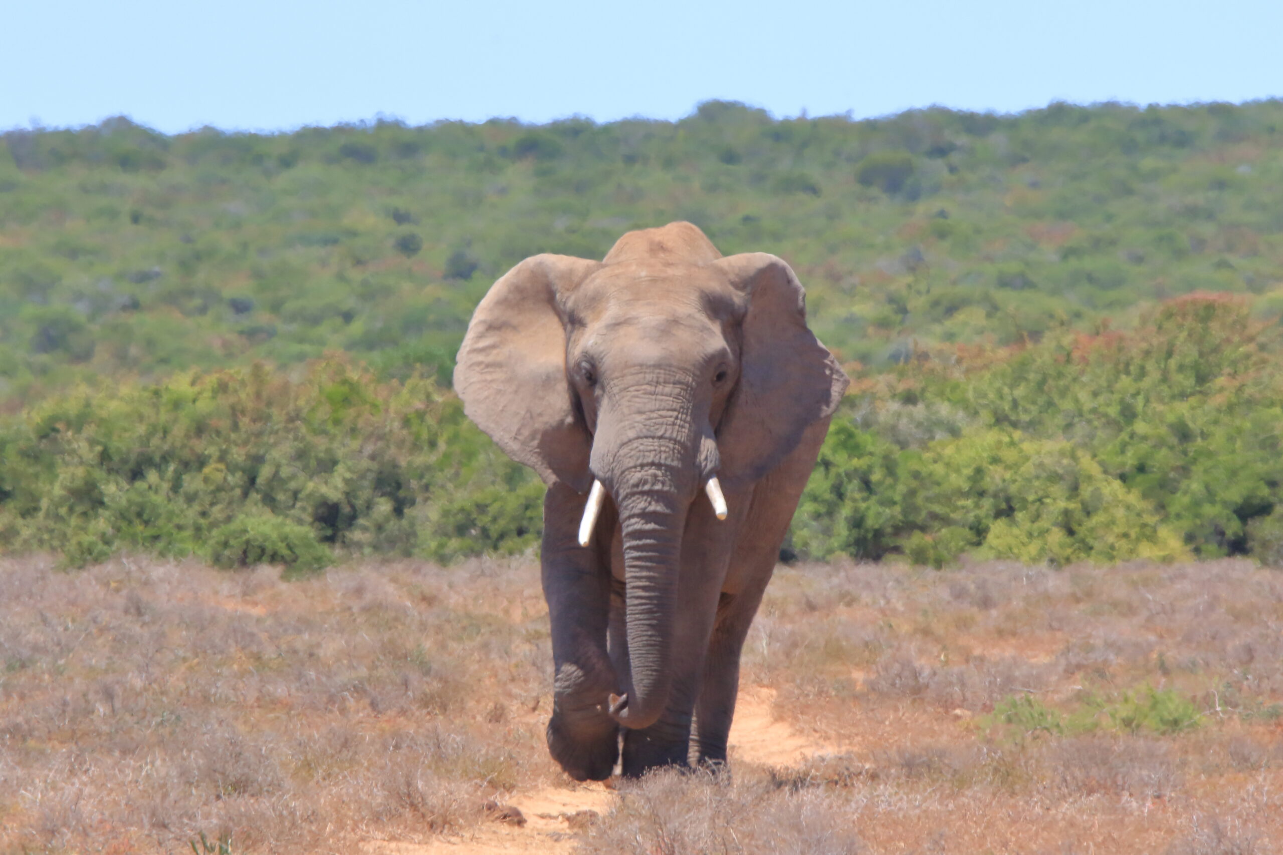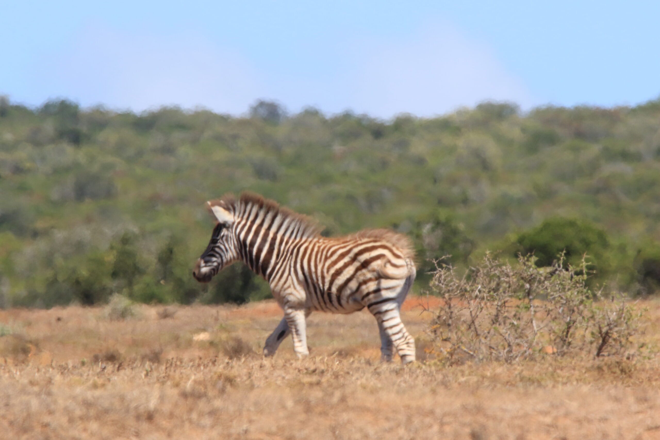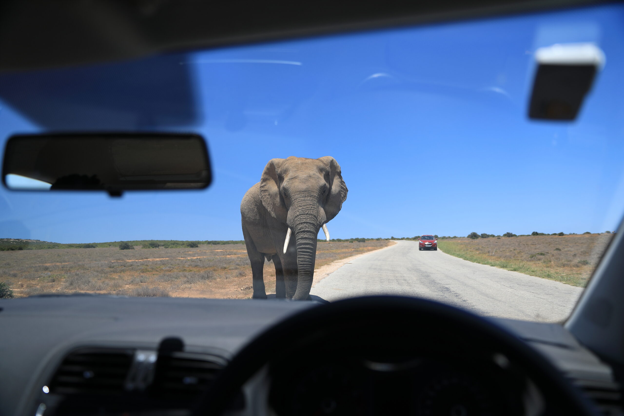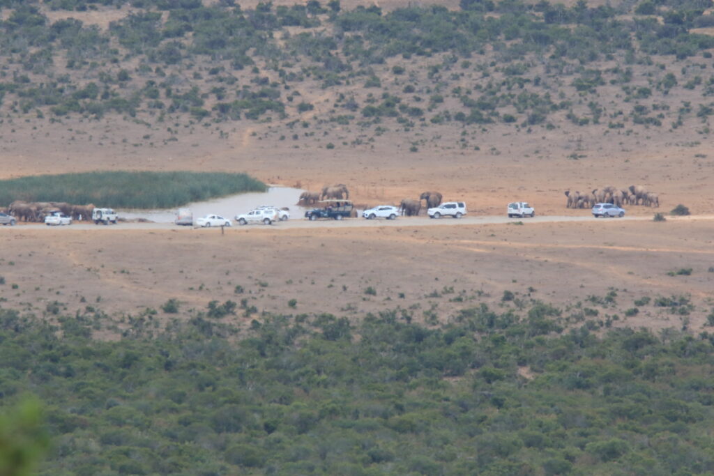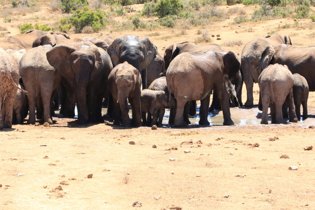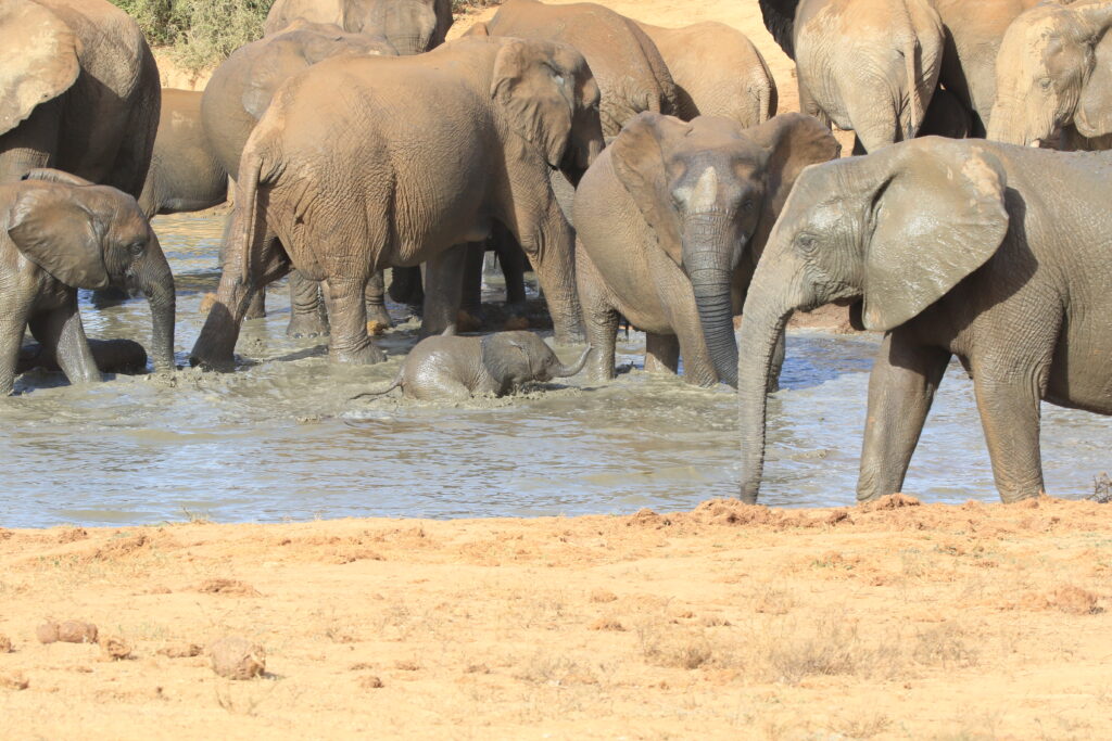 Guess what animals are prevalent in Addo Elephant National Park? I hope the name was sufficiently clear. There are several hundred elephants in the park so it is almost impossible to not see them while visiting. Because this is the middle of summer in the southern hemisphere, it is getting dry. That means most of the animals stay close to a water hole. The elephants especially like water holes so they can keep themselves cool. It’s fun to see them rolling around in the water and mud as they try to cool off. I was watching a large group that were submerging themselves in the deep part of the pond. As they were walking out, the little baby appeared.