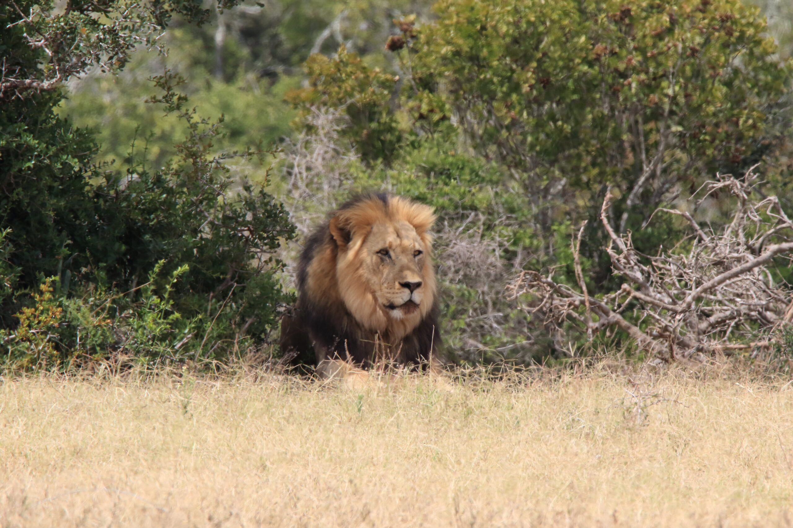 Because the animals have to find water, that narrows down the region where the predators have to look for them. Two lions were relaxing in the shade near a dry water hole in the south of the park. The other lion is hidden in the grass behind this one. Given how the nearby hole was dry, they might be waiting a while before any herds of animals arrive.