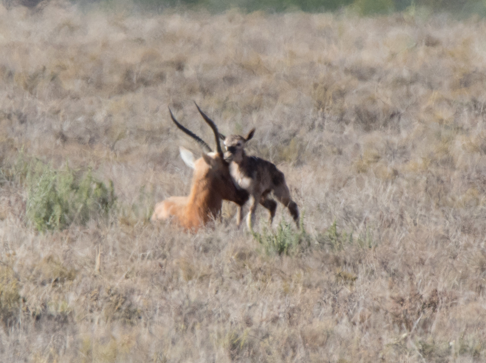 Seeing as how it was the only animal around, I kept one eye on it and one eye on the gravel road. I stopped when I saw it drop to the ground quickly and then a moment later a youngster jumped up. The baby started stumbling around and my first thought was “how old are you?” That was my reaction because it didn’t seem to have any coordination. I couldn’t believe there was any chance it was brand new. Odds were just way too great against that. But having grown up on a farm, its inability to walk reminded me of newborn horses when they take their first steps and those long legs aren’t communicating well with the brain. Wild babies have to gain coordination quickly to survive. They can’t afford more than a couple of hours without being able to keep up with the herd.