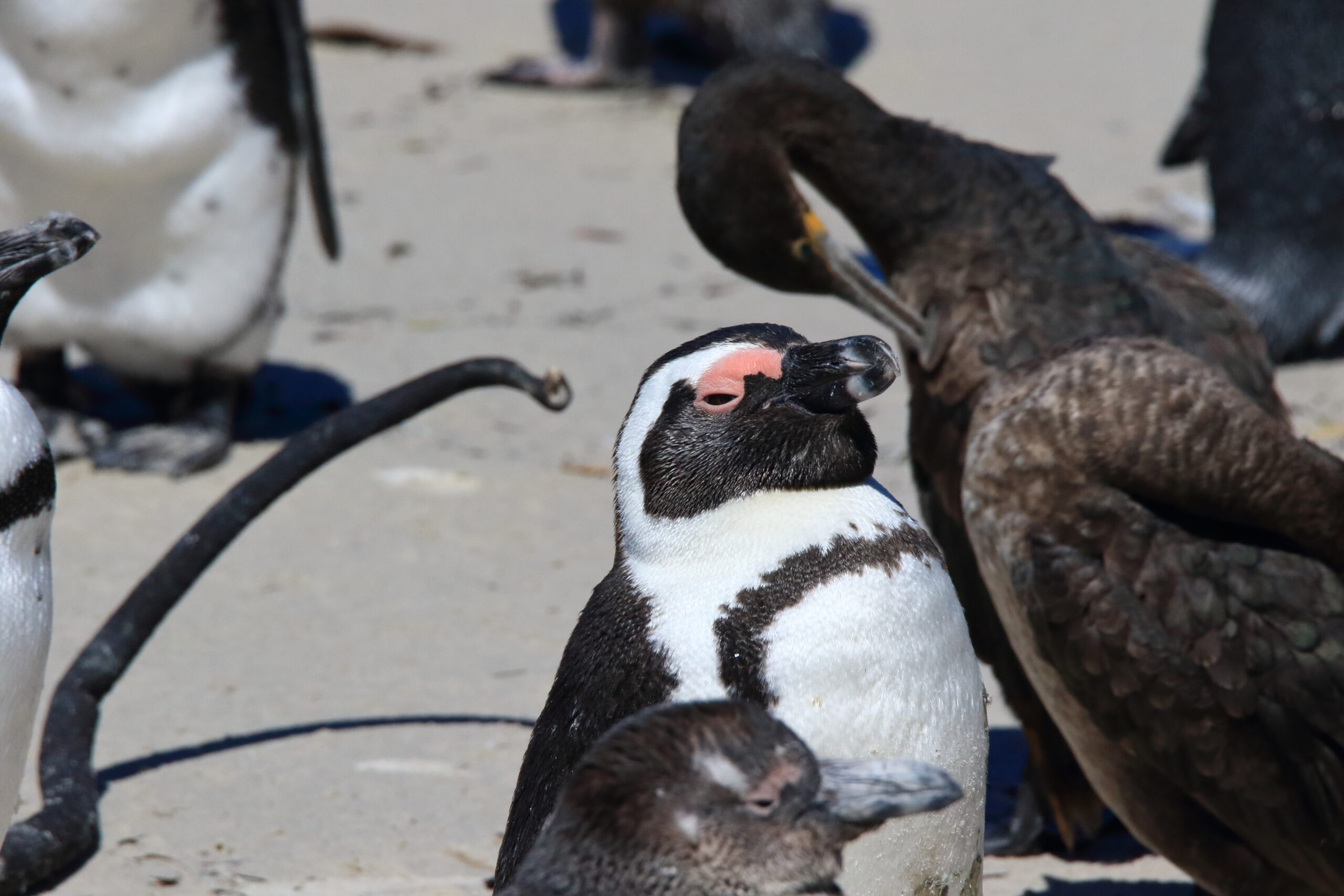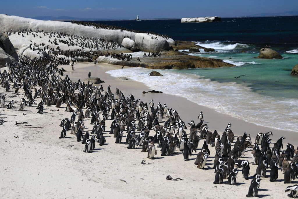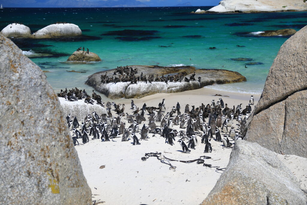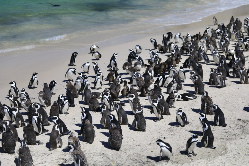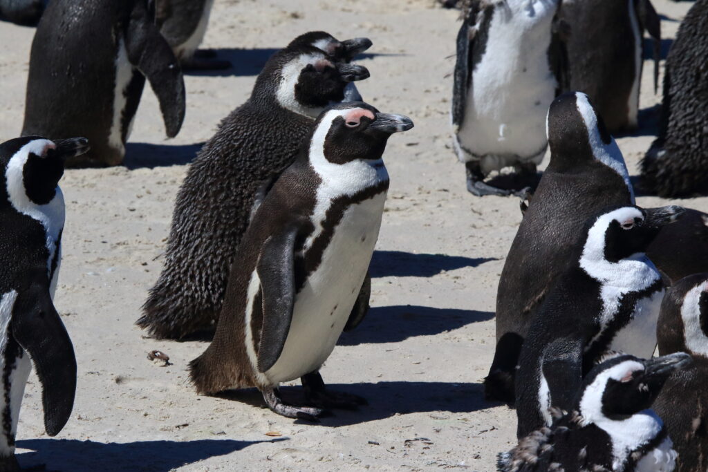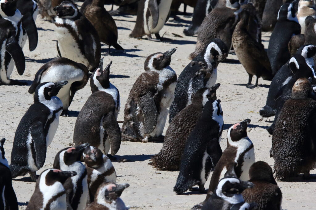 South of Cape Town is Simon’s Town, which is home to Boulders Beach. It is part of the Table Mountain National Park and one of the few places on the mainland where African penguins nest. For the most part the penguins prefer offshore islands. African penguins don’t sound like other penguins. They bray very loudly. Which is how they got their old name – jackass penguins. But that name isn’t considered polite anymore, so now they’re called African penguins. This year’s chicks are pretty much full grown and going through their molting to get their adult feathers. Soon they’ll be able to take to the water just like the adults.