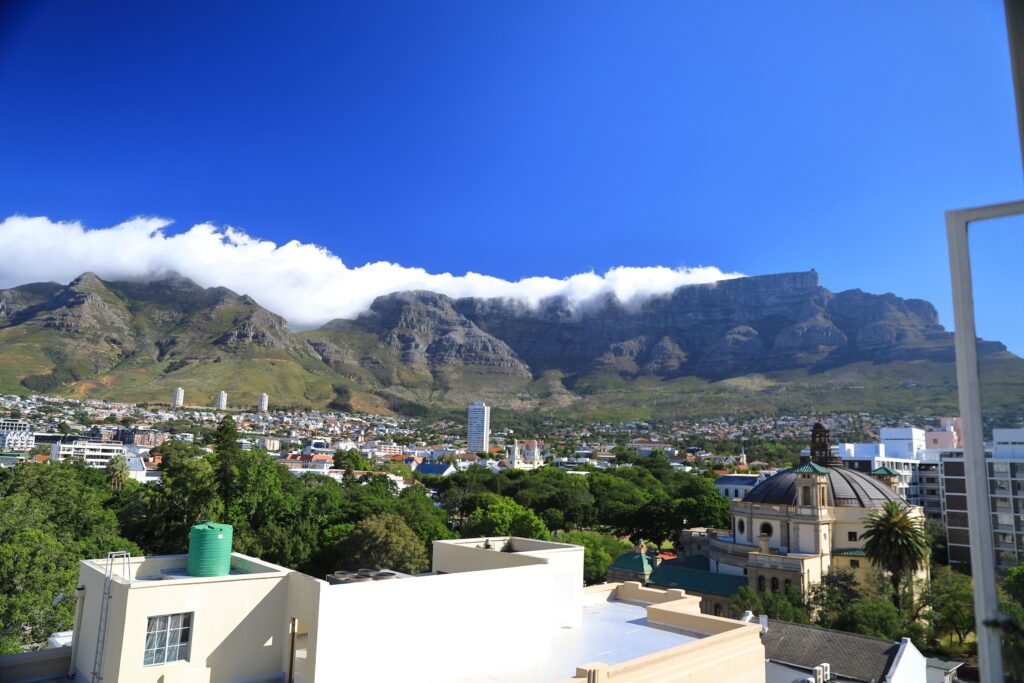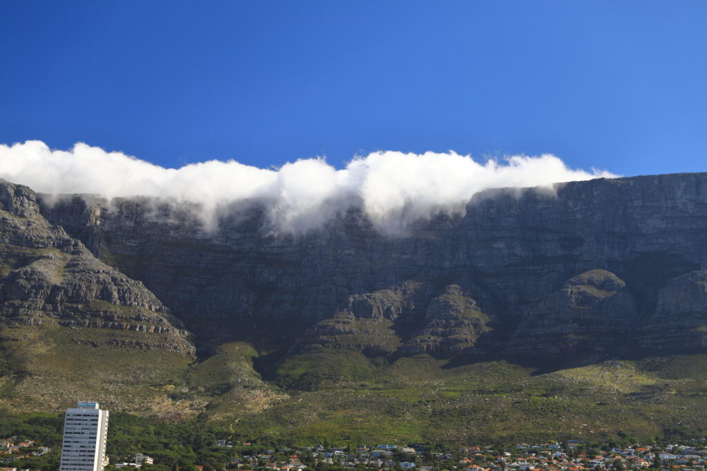 Table Mountain dominates the city. It is listed as one of the Seven Wonders of the Natural World and the only one in Africa. Besides being a massive visual presence, the mountain directly affects the local weather. The “tablecloth” clouds form over the mountain at sporadic intervals depending on the interplay of moist air and dry air on different sides of the mountain.